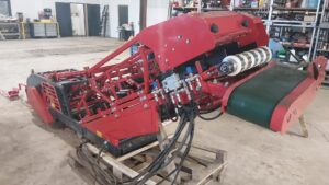 Turf Tick 1016 zodensnijder, zo goed als nieuw, nog geen 40 uur ingezet. Compleet met dwarsbandje, automatische besturing, borstel, snelheid hydr. regelbaar, hydr. palletlift, dak. Werkbreedte 40cm. De zodensnijder kan aan bijna iedere tractor van ca. 60PK gemonteerd worden (eigen gewicht ca. 3500kg) . Binnen enkele minuten demonteerbaar zodat de trekker voor andere werkzaamheden ingezet kan worden. Locatie is Nederland. Turf Tick 1016 Sodenschneider wie neu, weniger als 40 Betriebsstunden. Komplett mit Rasenquerband, automatischer Lenkung, Bürste, hydraulisch verstellbare Drehzahl, hydraulischem Paletlift und Dach. Der Sodenschneider kann an fast jeden Traktor ab 60PS ( Eigengewicht ca.3500kg) montiert werden. Er lässt sich in wenigen Minuten demontieren und der Traktor kann für andere Aufgaben eingesetzt werden. Standort Niederlanden. Turf Tick 1016 sod harvester, like new, less than 40 hours of use. Complete with cross conveyor, automatic steering, brush, hydraulically adjustable rotation speed, hydraulic pallet lift and roof. Working width 40cm. The sod harvester can be mounted to olmost any tractor of 60 HP ( own weight approx.3500kg) It can be disassembled in minutes, allowing the tractor to be used for other tasks. Located in Holland.